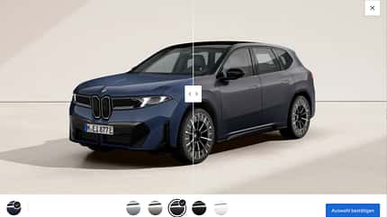 Natürlich werden die Veränderungen nach der Click-Auswahl direkt im Bild daneben sichtbar. Das gilt ebenso für die Anpassungen im Innenraum. Bei den Außenfarben ist BMW übrigens noch geizig. Es gibt gerade mal sechs Farbetöne – wobei es sich eigentlich um die Schattierungen von Weiß über Grau hin zu Schwarz handelt. Die einzig echte Farbe ist Ocean Wave Blau metallic. In dieser Lackierung wurde der neue iX3 auch während der IAA in München enthüllt. Immerhin kann man die Farben direkt über einen interaktiven Slider miteinander vergleichen.