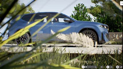 Unten in der Ansicht sieht man einen Play-Button, der Bäume und Gräser zum Leben erweckt. Und tatsächlich kann man die Kameraperspektive auf Frosch-Augenhöhe setzen und aus dem Gras sein neues Wunsch-Auto beobachten. Das gleiche immersive Erlebnis wartet übrigens auch im Innenraum. Wem das immer noch nicht reicht, der kann über einen weiteren Slider sogar die Lichtstimmung verändern – von greller Mittagssonne über Abendlicht bis in die dunkle Nacht hinein. Auf diese Weise kann man stufenlos den Stand der Sonne einstellen. Für digitale Spielkinder ist das nun wirklich "Neue Extraklasse."