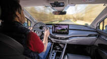 Serienmäßig ist dagegen der 13-Zoll-Screen des Infotainments. Der reagiert flink auf Berührungen. Online-Funktionen und Navigations-Software sind im 1590 Euro teuren Paket des HUD enthalten, sollen sich aber auch im Nachhinein "over the Air" freischalten lassen. Leider laufen die onlinebasierten Funktionen des MIB-4-Systems (Modularen Infotainment-Baukasten) beim ersten Testwagen nicht. Weshalb wir noch mal schnell umsteigen. Und siehe da, mithilfe von Touchslider, Gesten und Laura funktioniert hier alles.