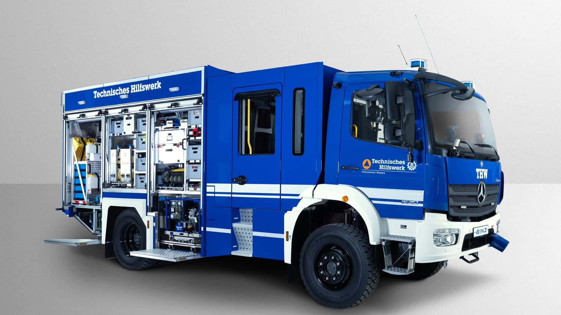 Das Technische Hilfswerk (THW) erhält eine umfassende Verstärkung seiner Fahrzeugflotte: Über 100 neue Gerätekraftwagen (GKW) auf Basis des Mercedes-Benz Atego 4x4 gehen bundesweit an die Ortsverbände. Das Jubiläumsfahrzeug mit der Seriennummer 75 wurde jüngst anlässlich des 75-jährigen Bestehens der Bundesanstalt an den Ortsverband Amberg übergeben. Insgesamt sind zunächst 120 Fahrzeuge mit Spezialaufbau bestellt, weitere 60 können bei Bedarf abgerufen werden.