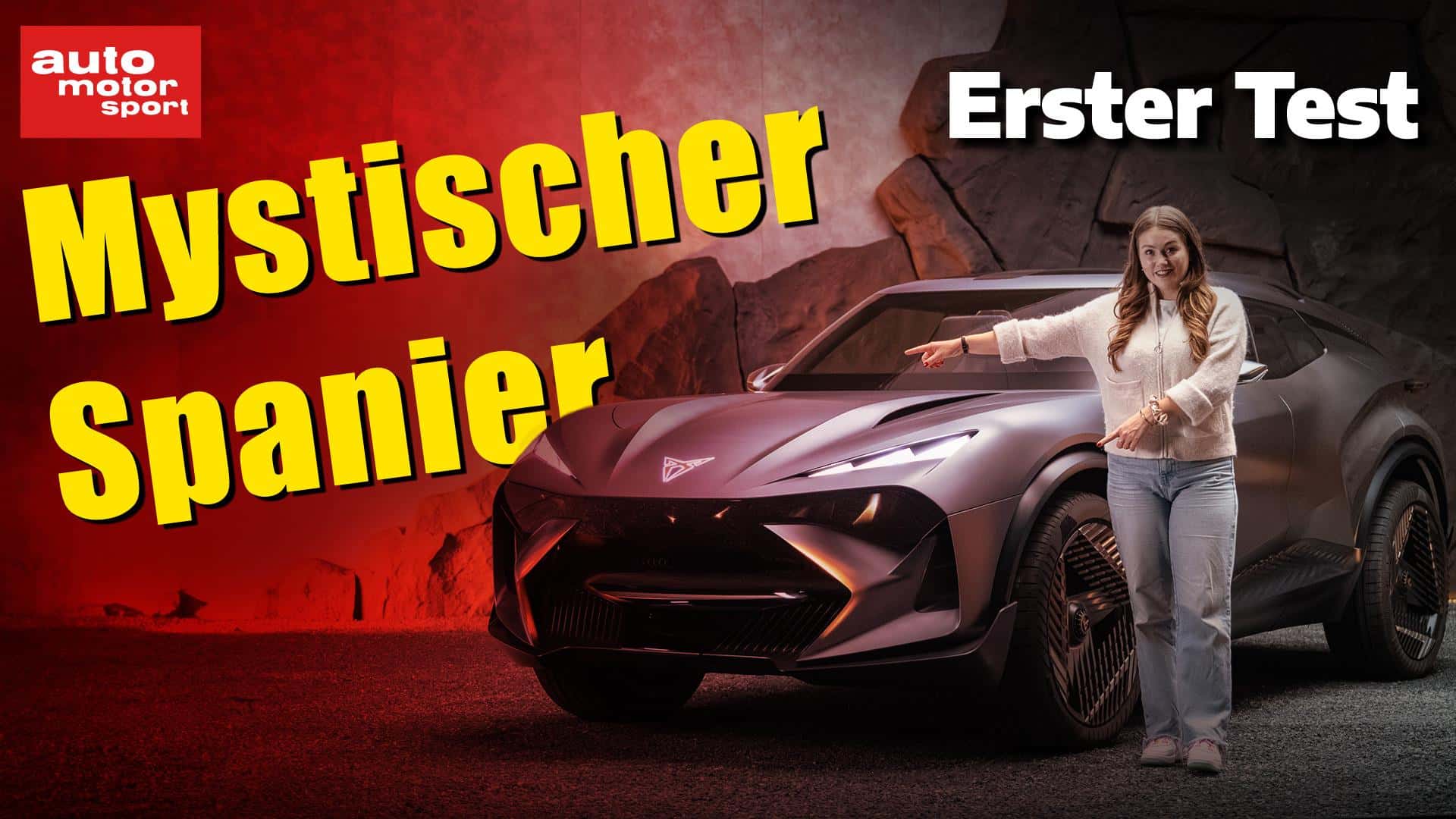 Im Profil fallen die großen 23-Zoll-Räder und gegenläufig öffnende Türen mit fehlender B-Säule auf. Das Einstiegskonzept dürfte es nicht in einen Serien-Cupra schaffen. Ein Y-förmiges Strukturelement im Dach erinnert an die Wirbelsäule eines Lebewesens. Seitliche Öffnungen im Dach könnten eine Dachreling andeuten. Das Heck zeigt die neue, dreidimensionale Interpretation des LED-Lichtbands mit eingebetteten Rückleuchten und dem Modellnamen an den seitlichen Enden. Darunter ist der Markenschriftzug auf der Heckklappe zu sehen. Die Cupra-Logos an beiden Enden der Karosserie sind illuminiert.