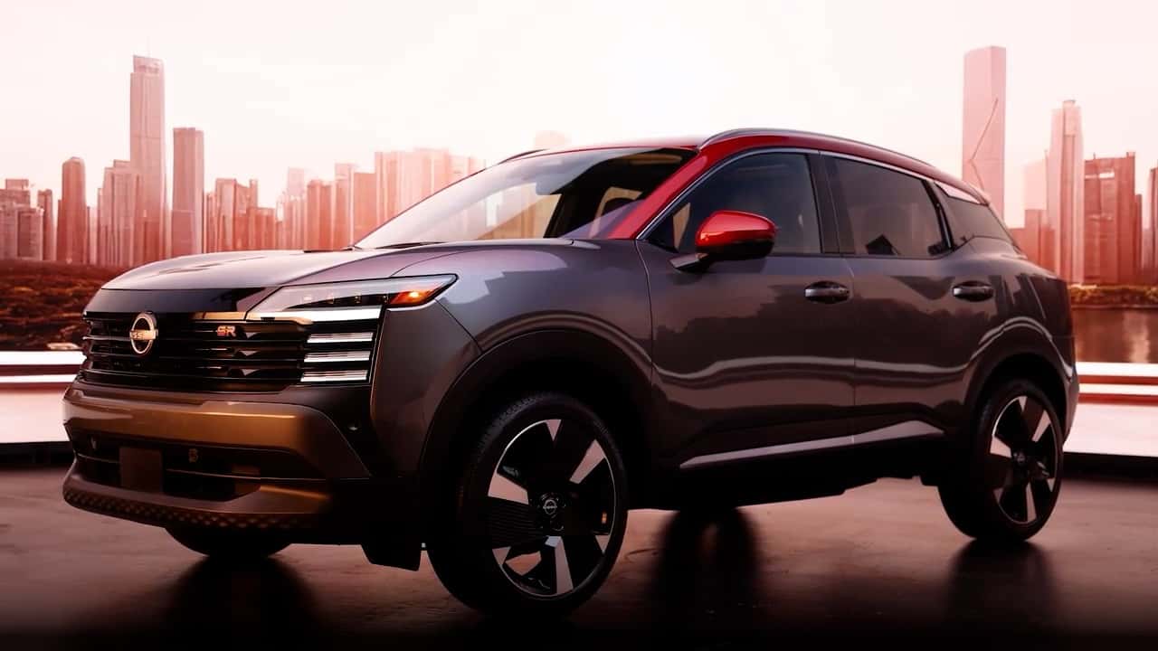 Der neue 4,36 Meter lange Kicks setzt auf eine steil im Fahrtwind stehende Front mit hoch angesetzter, flach verlaufender Fronthaube. Das Grillgitter mit vier quer verlaufenden Lamellen zieht sich über die gesamte Front und läuft seitlich in die LED-Tagfahrleuchten sowie die schlitzförmigen LED-Hauptscheinwerfer aus. Zentral platziert, trägt er das Nissan-Logo. Nach unten rundet die Front ein Spoiler mit Rautenmuster ab, das auch auf den ausgestellten Seitenschwellern aufscheint.
