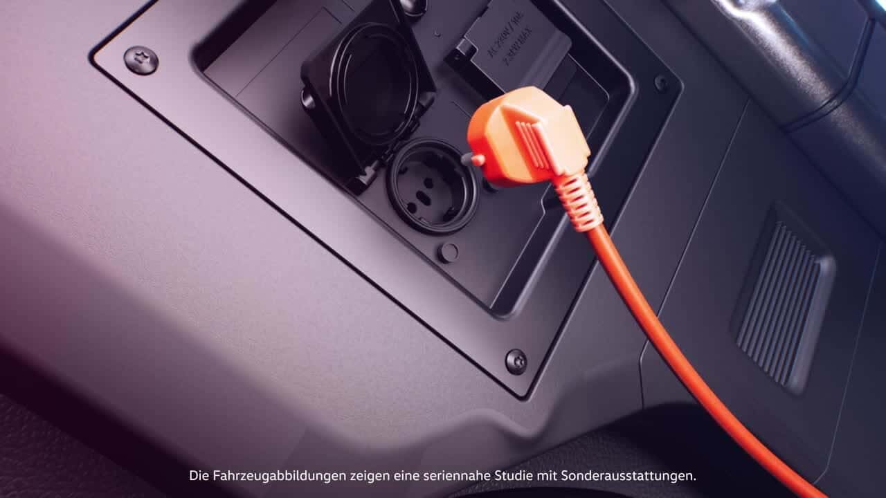 Für Smartphones gibt es in der Mittelkonsole eine Ablageschale mit einer optional induktiven Ladefunktion. Weitere Geräte können über bis zu sieben USB-C-, USB-A- und 12-Volt-Schnittstellen geladen werden. Darüber hinaus bietet VW für den neuen Transporter optional einen 230-V-Powerhub (400 W) samt Konverter an, um große elektrische Geräte aller Art mit Strom zu versorgen. Für die elektrischen bzw. elektrifizierten Varianten wird es auch einen Wechselrichter mit einer Leistung von 2,3 kW geben. Damit kann laut Volkswagen Nutzfahrzeuge auch eine Kreissäge betrieben werden.