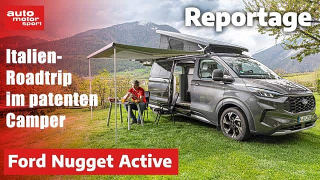 So viel also zur groben Routenplanung, fehlt nur noch ein geeignetes Reisemobil. Und hier kommt Ford zu Hilfe, denn seit fast 40 Jahren bauen die Kölner in Kooperation mit dem Campingspezialisten Westfalia den Nugget. 1986 rollte das erste Modell auf die Straßen und wurde über die Generationen seines Basismodells stets weiterentwickelt. Das aktuelle Resultat ist ebenjener Nugget Active, mit dem wir die nächsten Tage unterwegs sein werden. In 940 Euro teurem "Magnetic Metallic" fährt er vor, dazu passt ganz hervorragend der dunkle, L-förmige Küchenausbau der Active-Ausstattung. Neben der widerstandsfähigen Outdoor-Beplankung für Radläufe und Unterboden gehört auch ein speziell abgestimmtes Fahrwerk dazu. Jenes beinhaltet in der Serie 17-Zoll-Alufelgen, doch unser Testwagen hat die 714 Euro teure 19-Zoll-Variante verbaut. Ebenfalls im Active-Paket serienmäßig: ein Navigationssystem als Teil des 13 Zoll messenden Multifunktionsdisplays und die beheizbare Rücksitzbank, die auch im Liegemodus funktioniert. Grundpreis für die Variante mit dem von uns gefahrenen langen Radstand: 88.001 Euro. Doch dabei bleibt es natürlich nicht: Ein sehr praktisches Extra ist die zweite Schiebetür auf der linken Seite, die adaptiven Matrix-LED-Scheinwerfer helfen nachts auf engen Sträßchen, und der Fahrradträger für die Heckklappe sorgt für Velo-Mobilität. Für 2.995 Euro lässt sich zudem eine PV-Anlage für das Aufstelldach bestellen, womit der Nugget auch ohne Zeltplatz lange autark stehen kann.