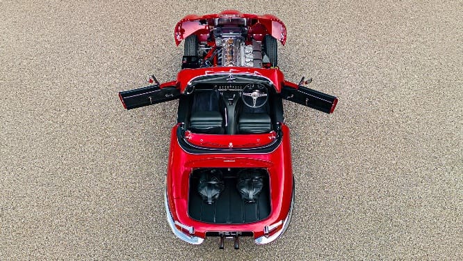 Es gibt viele Gründe, warum die erst 2020 zusammengestellte Truppe um Firmengründer und -chef Chedeen Battick 3.800 (Coupé) beziehungsweise 6.000 Stunden (Roadster) benötigt, um ein E-Type-Exemplar einem Restomod-Umbau zu unterziehen. Es beginnt beim Monocoque, das Helm zu mindestens 30 Prozent erhält, aber mit reichlich Stahl verstärkt, um die Verwindungssteifigkeit zu optimieren. Über das Chassis stülpen die Briten eine Karosserie, deren Motorhaube und Türen neu von Hand gefertigt werden; Letztere ebenfalls inklusive Verstärkung und mit Soft-Close-Funktion. Trotzdem bleibt das Gewicht mit etwa 1.200 Kilogramm im Rahmen.