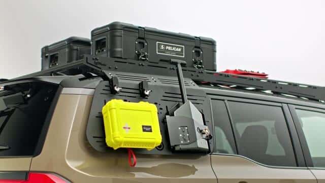 Die montierten Zubehörprodukte kommen von Lexus Associated. Dazu gehören die Lexus-Embleme an den seitlichen Schutzschwellern sowie weitere Lexus-Embleme an verschiedenen Stellen der Karosserie. Außerdem ist ein Lexus-Reifenkompressor an Bord. Der Dachträger kommt vom Spezialisten Prinsu aus Idaho Falls. Auf den Träger hat Lexus zwei wetterfeste und wasserdichte Pelican-Koffer gepackt – einmal einen BX90R und einen BX55S. Außerdem liegen dort zwei ARB-TRED-Pro-Sandbords. Die Leiter zum Erreichen des Dachgepäckträgers kommt ebenfalls von Prinsu.