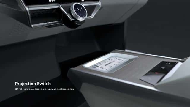 Hier bietet das Cockpit drei Highlights. Das Projektion Switch ist ein Touchdisplay in der Mittelkonsole. Es erlaubt per Finger-Tipp und-Slide verschiedene Einstellungen zum Beispiel der Klimaanlage (Temperatur, Gebläse, Klimatisierung) zu verändern.