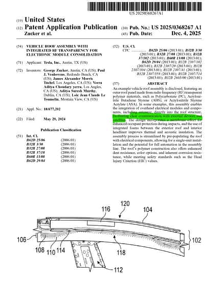 Konkret geht es um das US-Patent 2025/0368267 A1, das eine neuartige Fahrzeugdachkonstruktion beschreibt. Ziel dieser Entwicklung ist es, eine möglichst störungsfreie Funkkommunikation mit externen Netzwerken und Satelliten zu ermöglichen. Das Patent wurde öffentlich bekannt, nachdem es von einem Nutzer auf der Plattform X entdeckt worden war.