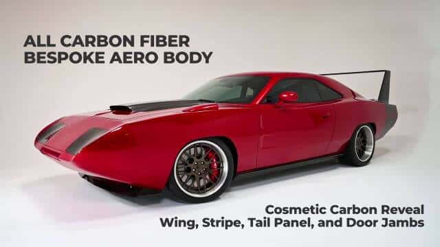Die historisch wirkende Karosserie ist in Wahrheit eine Neuanfertigung, die vollständig aus Carbon besteht. Experten erkennen das an den neuen Proportionen, denn der D69 Carbon Daytona ist fast 32 Zentimeter länger als der originale 1969er Dodge Charger, aber knapp 14 Zentimeter kürzer als der an seinem riesigen Heckflügel erkennbare Charger Daytona aus dieser Epoche. Am Heckfügel des Backdate-Muscle-Cars, an den darunterliegenden Seitenteilen, auf der Motorhaube und in einigen kleineren Bereichen trägt das Carbon noch seine Originalfarbe. Der Rest der Karosserie ist im Farbton Firenze-Rot-Perleffekt lackiert.