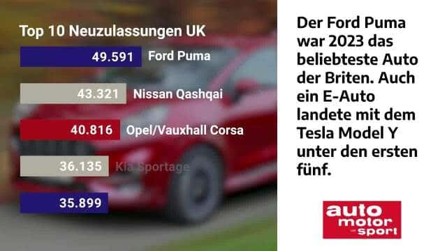 Der britische Automarkt war über Jahre hinweg ohne die Marken Vauxhall (Opel), Mini und Ford nicht denkbar. Immerhin konnte sich auch 2024 der Ford Puma souverän an der Spitze halten, Fiesta und Focus sind ins Nirvana abgestürzt. Noch schlimmer sieht es bei den beiden anderen Marken aus. Weder Mini noch Vauxhall können in den Top 10 punkten – der Corsa war 2023 immerhin auf Platz drei, der Mokka auf Rang zehn und der Mini auf Platz sieben.