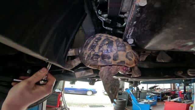 Mechaniker einer Werkstatt in Heidelberg trauten wohl ihren Augen kaum, als sie den Koreaner auf der Hebebühne für den Service vorbereiteten. Zwischen Antriebswelle und der Ölwanne zappelte im Motorraum eine Schildkröte, eingeklemmt mit ihrem Panzer, unfähig sich selbst zu befreien.