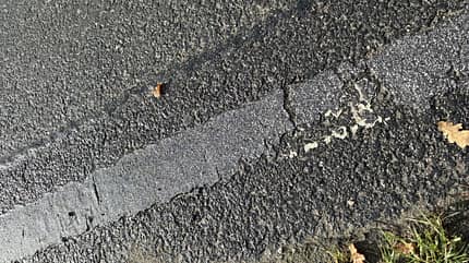 Die bröckelige Übermalung der weißen Fahrbahnmarkierungen ist deutlich erhaben, sodass sie bei Nässe und Gegenlicht wie eine normale Markierung erscheint. Das ließe sich stattdessen auch abfräsen.
