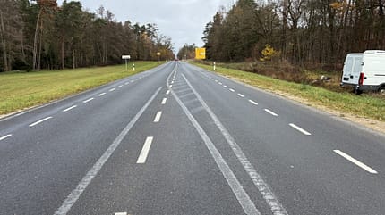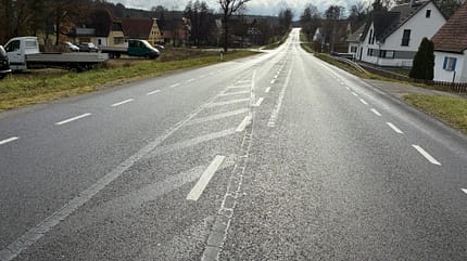 Aber mal ganz von vorn: In der Nähe einer Kleinstadt bei Nürnberg wurde vor einigen Jahren der vierspurige Ausbau der Bundesstraße 2 auf einer eigenen Trasse fertiggestellt. Die alte Streckenführung der Bundesstraße, ursprünglich eine breit ausgebaute Landstraße mit kleinen Seitenstreifen, dient seitdem nur noch dem Anliegerverkehr. Um in diesem, nun deutlich verkehrsreduzierten Bereich Platz für Radschutzstreifen und einen später angesetzten Radweg zu schaffen, wurde die Fahrbahn einseitig verschmälert und die Seitenstreifen entfernt. Die alten Fahrbahnmarkierungen wurden schwarz übermalt, weil sich die Fahrbahnmitte deutlich verschoben hat – soweit logisch.