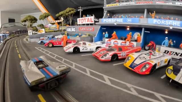 Aber die harten Fakten machen natürlich nicht den Charme der Slot-Car-Rennbahn aus. Es ist vielmehr die Szenerie, die sich vom 1971er-Kultfilm "Le Mans" inspiriert zeigt. Dessen Rennszenen wurden bekanntlich während des 24-Stunden-Rennens im Jahr zuvor gedreht, wobei ein mit Kameras bestückter Porsche-Bolide regulär am Rennen teilnahm und dieses sogar beendet hatte. Dieses Auto gehört hier ebenso zum Fuhrpark wie ein weiteres Ford-GT40-Slot-Car, das mit Kameras ausgerüstet ist.