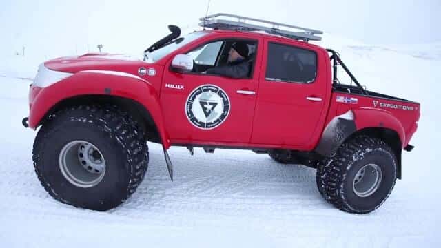 Der Hintergrund für die Riesenreifen ist keineswegs die Show auf der Flaniermeile, sondern purer Selbstzweck. Durch die extrem großen und breiten Reifen vergrößert sich die Aufstandsfläche, das Fahrzeuggewicht verteilt sich entsprechend besser. Wird dann auch noch die Luft abgelassen – die Isländer fahren im Tiefschnee mit Minimaldrücken von 0,2 bar – ergibt die nochmals vergrößerte Auflagefläche den ungefähren Vorwärtsdrang einer Pistenraupe. Das Auto sinkt im Schnee kaum noch ein und fährt über Flächen, die zu Fuß ohne Schneeschuhe nicht zu bewältigen sind.