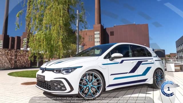 Im Innenraum dominieren blaue Ambientebeleuchtung und ein geschwindigkeitsabhängiges GTE-Hologramm. Der unveränderte Plug-in-Hybrid leistet 245 PS, dafür powert die Soundanlage mit 3.110 Watt. Praktisches Extra: Ein E-Skateboard im Kofferraum für die letzte Meile mit 45 km/h.