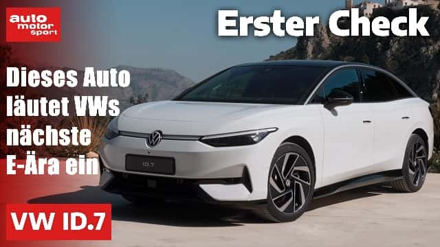 Die neue VW ID.7 Limousine will mit beeindruckenden Reichweiten und verbesserter Technik punkten. Im Video zeigen wir die wichtigsten Features des Elektro-Flaggschiffs aus Wolfsburg. Mit einem cw-Wert von 0,23 und dem neuen APP550-Motor erreicht der ID.7 bis zu 621 km Reichweite nach WLTP. Der 286 PS starke Antrieb beschleunigt die 4,96 Meter lange Limousine in 6,5 Sekunden auf 100 km/h. Dank 175 kW Ladeleistung sind 28 Minuten für 10-80% Ladung möglich. Im Innenraum überzeugt das neue 15-Zoll-Display mit verbesserter ID-Software 4.0, die deutlich schneller und intuitiver arbeitet. Besonderes Highlight sind die optionalen ErgoActive-Sitze mit elf Massageprogrammen. Der Kofferraum fasst 532 Liter. Preislich startet der ID.7 Pro bei 56.995 Euro.