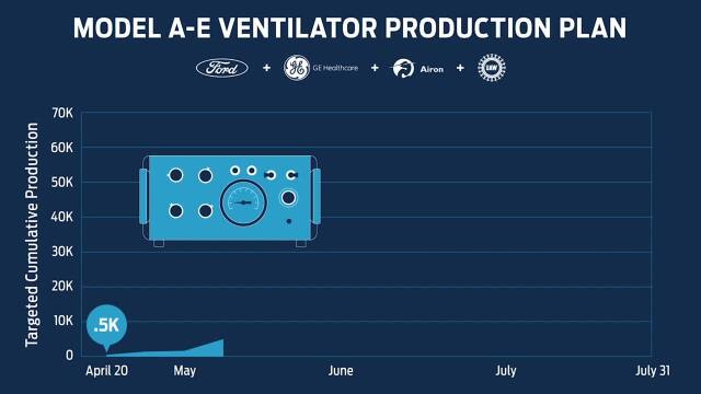 Ford und GE bauen das Beatmungsgerät Model A-E unter der Lizenz der Airon Corporation aus Melbourne im US- Bundesstaat Florida. Die Produktion startet am 20. April im Ford-Werk Rawsonville im US-Bundesstaat Michigan. In den ersten 100 Tagen nach dem Produktionsstart sollen 50.000 Beatmungsgeräte entstehen, danach ist ein monatlicher Ausstoß von 30.000 Geräten geplant. Ford-Chef Jim Hackett betont, dass die Umstellung des Rawsonville-Werks und die Produktion in enger Abstimmung mit der Gewerkschaft UAW (United Auto Workers) geschieht.