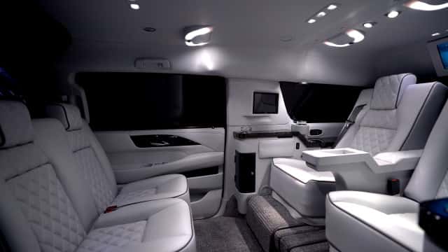Er kann sich aber auch die eigenen Filme anschauen, und zwar in Ultra-HD! In der Trennwand zwischen Cheuffeur- und Passagier-Bereich ist der dafür nötige 43-Zoll-LCD-Bildschirm mit Internetverbindung untergebracht. Letztere stellt ein nach Militär-Spezifikationen konstruierter On-Board-Router sicher, der mit gleich zwei SIM-Karten verschiedener Mobilfunkanbieter arbeitet, damit Stallone auch ja immer im besten Netz surft. Natürlich ist der Monitor an ein Soundsystem mit digitaler 7.1-Ausgabe gekoppelt.