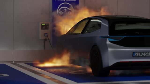 Die Animation zeigt ein revolutionäres Brandschutzsystem für Elektrofahrzeuge: Ecell Guard erkennt automatisch entstehende Brände und wirft blitzschnell eine 6x8 Meter große Schutzdecke über das Fahrzeug. Das vom baden-württembergischen Unternehmen Riester GmbH entwickelte System arbeitet dabei komplett autark - dank Akkubetrieb auch bei Stromausfall.
