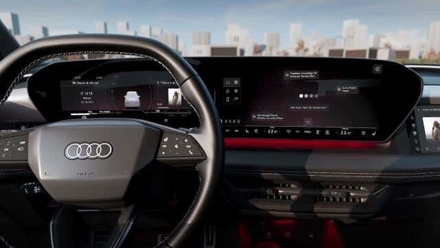 Der neue Audi Q6 e-tron präsentiert sich mit einem komplett digitalisierten Cockpit: Zwei gebogene Displays hinter einer gemeinsamen Glasfläche bilden das Herzstück. Optional erhält der Beifahrer einen eigenen Screen für Filme und Entertainment. Das neue E³-Infotainmentsystem basiert auf Android Automotive und ermöglicht Over-the-Air-Updates. Ein selbstlernender Sprachassistent steuert zahlreiche Funktionen. Besonders innovativ: Die OLED-Heckleuchten mit über 300 Segmenten können ein Warndreieck darstellen. Eine LED-Lichtleiste im Cockpit reagiert auf Sprachbefehle und Fahrsituationen. Das optionale Bang & Olufsen Soundsystem mit 22 Lautsprechern und 830 Watt sorgt für 3D-Klang. Für die Unterhaltung an der Ladesäule stehen AR-Games im Head-up-Display bereit.