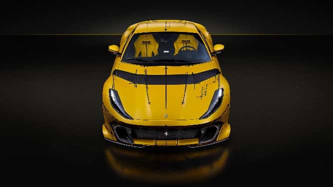 Der Ferrari 812 Competizione erhält von der Tailor Made Abteilung ein besonderes Einzelstück. Das One-Off-Modell zeigt sich in kräftigem 'Giallo Tristrato'-Gelb mit aufgebrachten Design-Skizzen in mattem Schwarz. Diese Zeichnungen stammen vom ursprünglichen Gestaltungsprozess des Chefdesigners Flavio Manzoni.