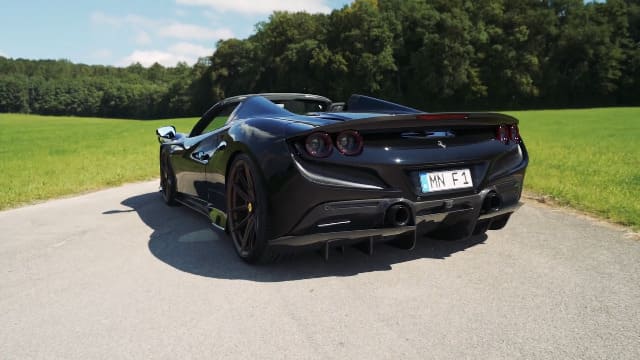 Der Ferrari F8 Spider erhält von Novitec eine umfassende Performance-Kur. Im Video zeigt der Tuner aus dem Unterallgäu seine Interpretation des offenen Mittelmotorsportlers. Das Leistungs-Plus von 82 PS katapultiert den V8-Biturbo auf 802 PS und 898 Nm. Damit sprintet der Zweisitzer in nur 2,6 Sekunden auf 100 km/h und erreicht über 340 km/h Spitze. Ein komplettes Karbon-Bodykit mit Frontspoiler, Seitenschwellern und Diffusor optimiert die Aerodynamik. Massive Schmiederäder in 21/22 Zoll betonen die Keilform. Besonderes Highlight: Die Hochleistungs-Abgasanlage ist optional in Feingold erhältlich. Ein Liftsystem hebt die Front bei Bedarf um 40 Millimeter an. Der Innenraum lässt sich nach Kundenwunsch mit Leder und Alcantara veredeln.