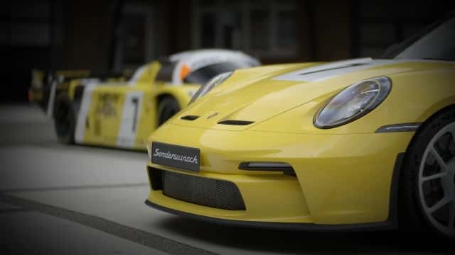Die markante Lackierung in Sommergelb, Weiß und Schwarz samt Startnummer 7 zitiert den legendären Sieger-956. Vorne drehen sich weiße Felgen in Anlehnung an die historischen Aero-Blenden, hinten glänzt goldenes Schmiedealu. Exklusive Details wie die speziell gefertigten Sideblades am Heckspoiler und ein aus dem Vollen gefräster Schaltknauf in 956-Optik machen den GT3 zum automobilen Zeitdokument. Das schwarze Interieur trägt Le Mans-Silhouetten in den Kopfstütz