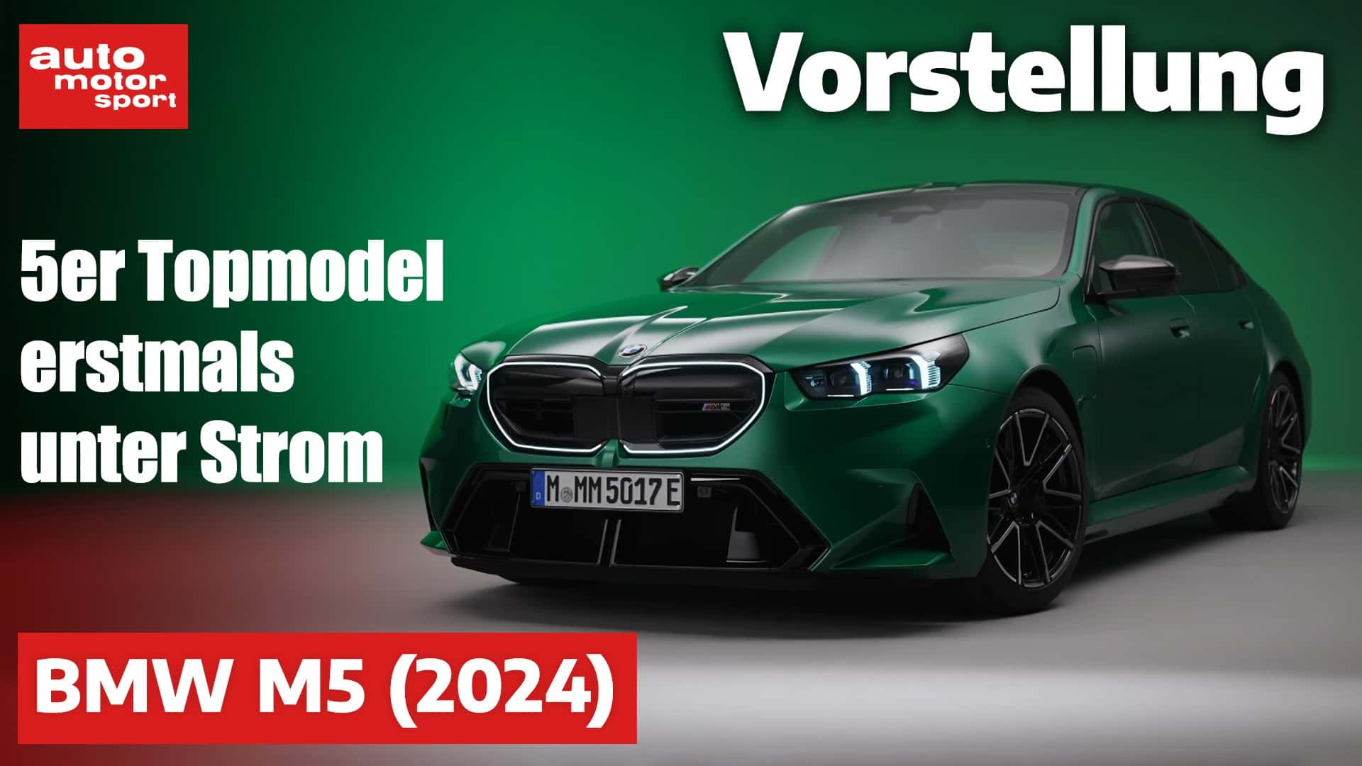 BMW präsentiert den neuen M5 erstmals mit elektrifiziertem Antrieb. Die siebte Generation des M5 hebt sich optisch deutlich von der Limousine ab und bietet ein neues Design, inspiriert vom Motorsport. Die Fahrzeugbreite wurde im Bereich der Vorderräder um 75 Millimeter und im Heckbereich um 48 Millimeter vergrößert. Der zentrale Lufteinlass in der kantigen Frontschürze wächst und rückt näher an die beleuchtete MM heran. Ein neues Design-Element in der spezifischen Frontgestaltung, inspiriert vom Motorsport, ist der Mittelsteg. Die Seitenlinie oberhalb der Türgriffe läuft beim M5 früher aus als bei der Limousine. Weitere schwarze Akzente setzen das optionale Carbondach und die ebenfalls optionalen Carbon-Spiegelkappen. Der M5 steht auf 20-Zoll-Leichtmetallrädern an der Vorder- und 21-Zoll-Rädern an der Hinterachse. Am Heck sitzt ein M-Spoiler und ein zweiteiliger Diffusor. Unter der Haube arbeitet ein 4,4-Liter-Twin-Turbo-V8, der erstmals elektrisch unterstützt wird. Das Antriebssystem leistet ein Systemdrehmoment von 1000 Nm sowie 772 PS. Damit sprintet der M5 in 3,5 Sekunden von 0 auf 100 km/h. Verschiedene Fahrmodi und eine umfangreiche Serienausstattung runden das Paket ab. Entdecken Sie mehr spannende Details im Video.