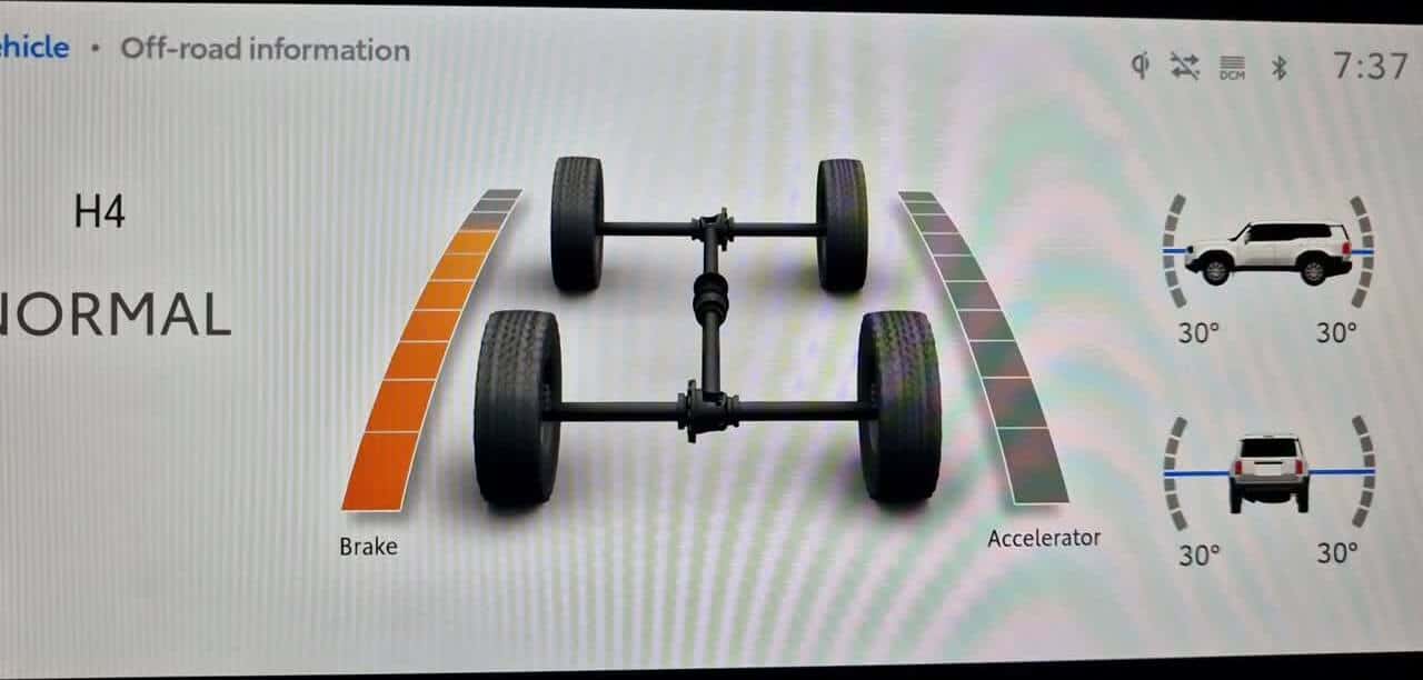 3. Offroad-Anzeigen und Stabi entkoppelbar: Bei Geländefahrt besonders wichtig: Auch Radpositionen, Schrägfahrwinkel, aktivierte Differenzialsperren oder Verschränkung der Achsen lassen sich über ein Menü auf dem Zentral-Bildschirm in Echtzeit anzeigen.