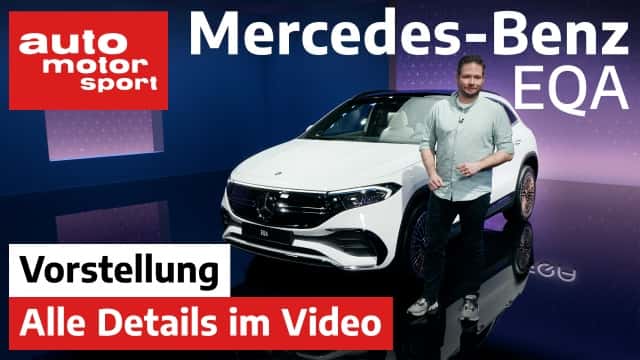 Der Mercedes EQA überträgt die elektrische Zukunft auf das beliebte Kompakt-SUV-Format. Im Video-Check nehmen wir das Platzangebot und die Variabilität unter die Lupe. Trotz der 66,5 kWh großen Batterie im Unterboden bleibt der Innenraum geräumig. Der Kofferraum fasst 340 Liter, 100 Liter weniger als beim GLA. Die elektrische Heckklappe und die umklappbaren Rücksitze erleichtern das Beladen. Im Fond profitieren die Passagiere von der SUV-typischen erhöhten Sitzposition. Das MBUX-System mit zwei 10,25-Zoll-Displays präsentiert alle wichtigen Informationen zum elektrischen Fahrbetrieb. Die Reichweite beträgt je nach Version zwischen 426 und 540 Kilometer nach WLTP. Am Schnelllader lädt der EQA mit bis zu 100 kW, was 30 Minuten für 80 Prozent Akkukapazität bedeutet.