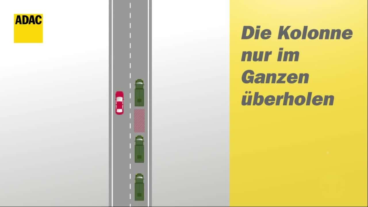 Generell gilt: Eine Kolonne darf überholt werden. Allerdings sollte dies "in einem Rutsch" passieren, ohne sie durch Einscheren zu trennen. Das geht fast nur auf Autobahnen oder mehrspurigen Schnellstraßen. Drängen Sie sich nicht zwischen die Fahrzeuge. Das gilt ebenso, wenn Sie auf einen Konvoi auflaufen und überholen wollen. Warten Sie auf eine Gelegenheit, die es erlaubt, den kompletten Konvoi sicher zu überholen. Beachten Sie zudem die Fahrzeugbreite der Militärfahrzeuge – nicht immer steht Ihnen die komplette Fahrspur zum Überholen zur Verfügung. Im Zweifel wählen Sie eine andere Route oder bleiben hinter dem Konvoi.