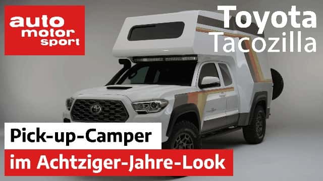 Toyota präsentiert auf der SEMA 2021 mit dem Tacozilla einen außergewöhnlichen Camping-Pick-up. Basis ist ein Tacoma TRD Sport mit dem 278 PS starken 3,5-Liter-V6, der 360 Nm leistet. Das Showcar erhielt ein Offroad-Fahrwerk mit 5 cm mehr Bodenfreiheit und 285/70/17 All-Terrain-Reifen. Highlight ist die maßgefertigte Wohnkabine im 80er-Jahre-Design mit 'Vintage Yellow'-Lackierung und Bronze-Orange-Streifen. Die Toyota Motorsports Garage entwickelte die isolierte Kabine mit Stehhöhe für 1,80 Meter große Personen. Innen bietet der Tacozilla Nasszelle mit Warmwasserdusche, Küchenzeile und Schlafplatz im Alkoven. Clever: Ein zweiter Akku im Motorraum versorgt die Bordelektrik. Der aufwändig gestaltete Durchgang zwischen Fahrerkabine und Wohnraum sowie die aerodynamisch optimierte Form unterstr